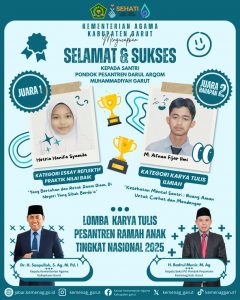 Selamat dan Sukses atas Prestasi Santri Pondok Pesantren Darul Arqam Muhammadiyah Daerah Garut dalam Lomba Karya Tulis Pesantren Ramah Anak Tingkat Nasional 2025. Kami dengan bangga mengucapkan Selamat dan Sukses kepada santri-santri Pondok Pesantren Darul Arqam Muhammadiyah Garut berprestasi yang telah mengharumkan nama pondok dan daerah dalam ajang Lomba Karya Tulis Pesantren Ramah Anak Tingkat Nasional 2025.